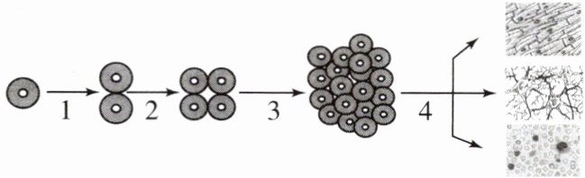 2.D [过程1、2、3细胞分裂使细胞数目增多,过程4细胞分化形成不同的组织,都是生物体生长发育的基础。过程2、3表示细胞分裂,细胞分裂过程中染色体变化明显,先经过复制后平均分配到两个新细胞中,新形成的细胞和原细胞的染色体数目和形态相同。]