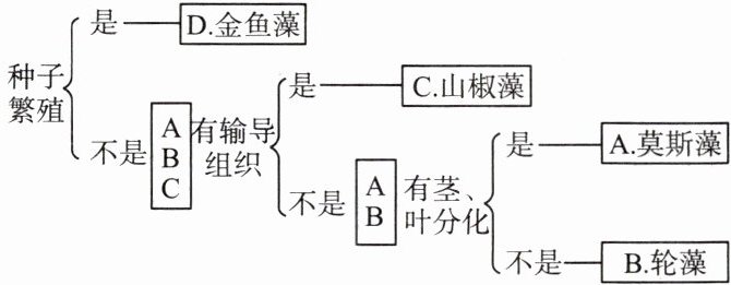 10. (科学思维)鱼缸造景是在热带鱼饲养与种植水草的基础上新兴起来的一项艺术,被称为“玻璃后面的艺术”,每年在世界许多地方还举行水族箱造景比赛。造景过程中,金鱼藻、莫斯藻、轮藻、山椒藻等水草的贡献不可小觑,它们都属于藻类吗?如图为这四种生物的分类简图。请据图回答下列问题。