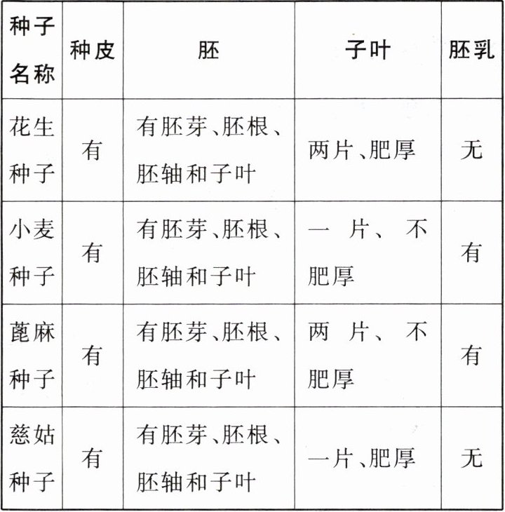 (3)双子叶植物的种子有两片子叶,单子叶植物的种子有一片子叶。据表可知,种子有无胚乳与子叶的数目是一片还是两片无关。]