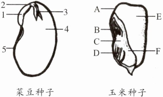 A. 菜豆种子中的营养物质储存在4子叶中,玉米种子中的营养物质储存在E胚乳中