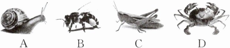 A [蜜蜂、蝗虫、螃蟹的体表有坚韧的外骨骼,身体和附肢都分节,属于节肢动物;蜗牛身体柔软,具有贝壳,为软体动物。]