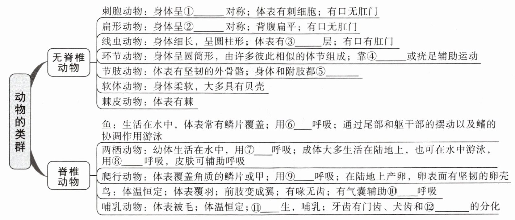 ①辐射 ②两侧 ③角质 ④刚毛 ⑤分节 ⑥鳃 ⑦鳃 ⑧肺 ⑨肺 ⑩肺 ⑪胎 ⑫臼齿