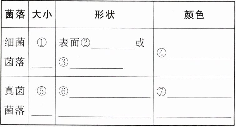 1.细菌、真菌和病毒 2.细菌或真菌 3.①小 ②光滑黏稠 ③粗糙干燥 ④白、黄、红等 ⑤大 ⑥绒毛状、絮状或蜘蛛网状 ⑦白、红、褐、绿、黑、黄等