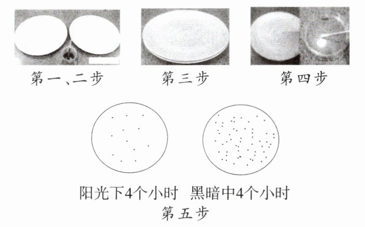 (4)①进行重复实验(或“设置重复组”);②盘子应与培养皿对应编号或做标记;③两个盘子最好不要叠放,应分开放置,其中一个用纸或黑布遮光;④第四步最好增加一个用无菌棉棒蘸无菌水,直接在培养基上涂抹的组作为空白对照