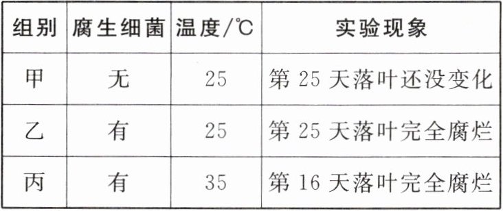 12. (河北廊坊三河市开学考试)小明为了探究“腐生细菌对植物落叶的分解作用”,将经过灭菌处理的落叶均分成甲、乙、丙三组,按下表设计,浇上等量的蒸馏水,放在无菌环境中进行培养,并记录到如下实验现象,请根据表格分析并回答问题。