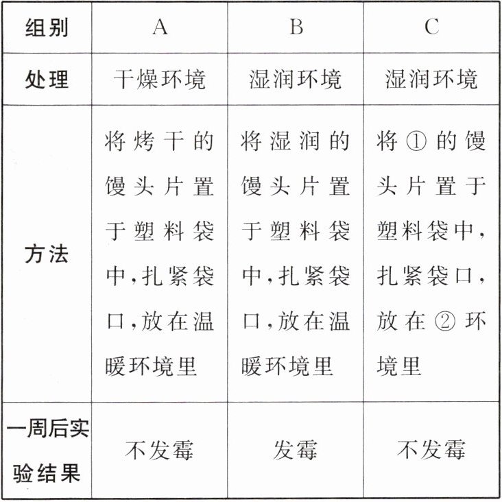 (3)为了探究温度对霉菌生活的影响,C组中①②的条件分别是湿润和