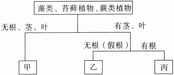 D [藻类结构简单,无根、茎、叶的分化,故甲代表藻类;苔藓有类似茎和叶的分化,但没有真正的根,故乙代表苔藓;蕨类有根、茎、叶的分化,体内有输导组织,一般长得高大,故丙代表蕨类。]