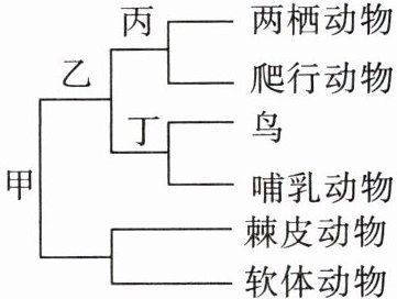 D [以体温是否恒定为依据进行分类的是乙,两栖动物和爬行动物的体温不恒定,属于变温动物,而鸟和哺乳动物的体温恒定,属于恒温动物。乙不能以受精方式作为分类依据,鸟、爬行动物和哺乳动物的受精方式是体内受精,两栖动物的受精方式是体外受精。大多数鸟能够飞行,但是有鸟不能飞行,哺乳动物中的蝙蝠也能飞行,所以丁不能以有无飞行能力作为分类依据。以有无脊柱作为分类依据的是甲,因为两栖动物、爬行动物、鸟、哺乳动物的体内有由脊椎骨构成的脊柱,属于脊椎动物,棘皮动物和软体动物属于无脊椎动物,体内没有由脊椎骨构成的脊柱。]