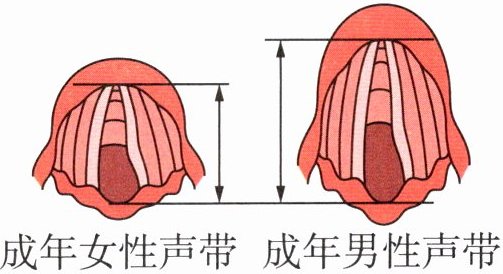 (3) 成年女性和男性的声带各长 11 毫米和 15 毫米左右(如图所示),因此成年男性的音高通常比女性( )。