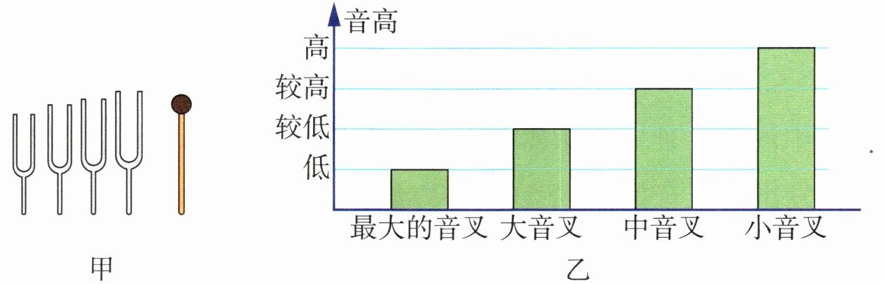 4. 豆豆用橡皮槌轻轻敲击大小不同的四个音叉(如图甲所示),听它们发出的声音并绘制了柱形图(如图乙所示)。