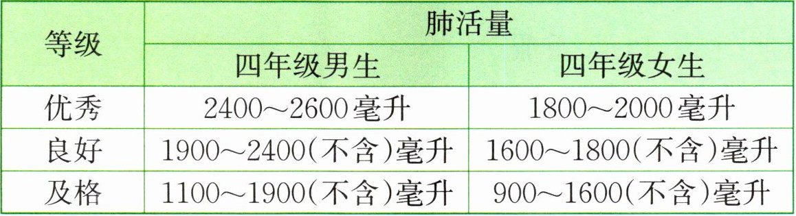 毫升,根据下表中的肺活量等级标准,她的等级应该是及格