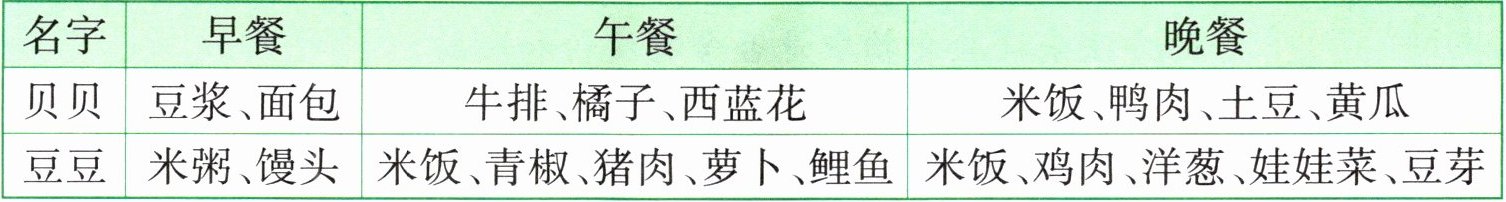 3. 下表是某一天贝贝和豆豆的食物统计表,请根据所学知识回答下列问题。