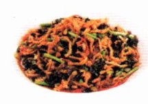 4. 如图所示为一道常见的家常菜——鱼香肉丝。鱼香肉丝的做法有许多种,元元选择的做法中所用的食材包括猪肉、豌豆尖、黑木耳、莴笋丝、胡萝卜丝、竹笋丝、干辣椒、土豆丝、青椒,请据此回答下列问题。