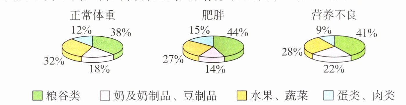 [解析]比较正常体重人群和肥胖人群,发现肥胖人群的食物中粮谷类和蛋类、肉类所占的比例偏高。