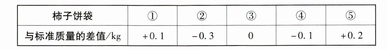 素材 $1$ 每年秋天是灵昆柿子饼盛产期. 小黄同学打算从灵昆寄 $5$ 袋柿子饼到杭州,以每袋 $3$ kg 为标准,超过的千克数记为正数,不足的千克数记为负数,记录如下表所示: