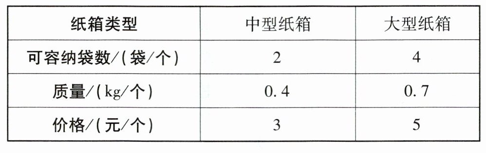 素材 $2$ 小黄同学选择了某快递,收费标准如下:$3$ kg 以内 $15$ 元(含 $3$ kg),超过 $3$ kg 的部分为 $2$ 元/kg(不足 $1$ kg 按 $1$ kg 计). 现该快递公司提供多种寄件包装方式(如表所示):