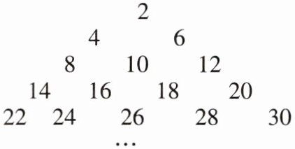 6 [2024绵阳中考]如图,将全体正偶数排成一个三角数阵,从上向下数有无数多行,其中第一行有1个数为2,第二行有2个数为4,6,…,第n行有n个数……探究其中规律,你认为对于某行从左至右第3个数不可能是 (