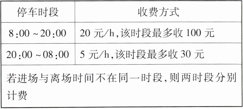 5 [2023 台湾中考]乐乐停车场为 24 小时营业,其收费方式如表所示,已知阿虹某日 10:00 进场停车,停了 x h 后离场,x 为整数. 若阿虹离场时间介于当日的 20:00 ~ 24:00 间,则他此次停车的费用为多少元? (