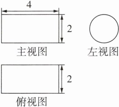 4π 根据题中的三视图可得,该几何体是圆柱,且底面圆的直径为2,所以底面圆的面积为$1^{2}\cdot π=π$,所以该圆柱的体积为$π×4=4π$($V_{圆柱}=$底面积×高)。