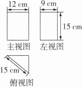 540 由题中的三视图可知,该几何体是一个三棱柱,其侧面是三个长方形。根据主视图可得,第一个长方形的面积是$12×15=180(cm^{2})$;根据左视图可得,第二个长方形的面积是$9×15=135(cm^{2})$;根据俯视图可得,第三个长方形的面积是$15×15=225(cm^{2})$,所以该几何体的侧面积为180 + 135 + 225 = 540($cm^{2}$)。