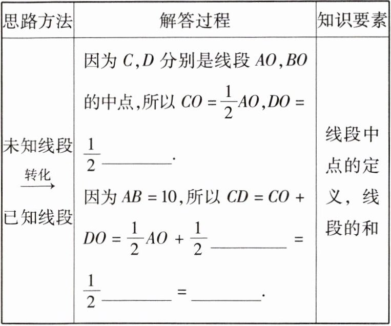 14 运算能力 数学课上,黎老师提出问题:如图,O是线段AB上一点,C,D分别是线段AO,BO的中点,当AB = 10时,求线段CD的长.