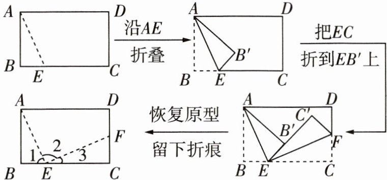D 根据折叠的性质可知,∠1=∠AEB',∠3=∠FEC',所以∠2=∠1+∠3.因为∠1+∠AEB'+∠3+∠FEC'=180°,∠AEB'+∠FEC'=∠2,所以∠2+∠1+∠3=180°,所以∠1+∠3=90°,即∠1与∠3互余.因为点E在BC上,所以∠1+∠AEC=180°,所以∠1与∠AEC互补.根据题中条件无法得到∠1=∠3,所以无法得到EC'平分∠AEF.
