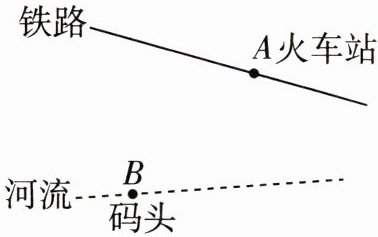 13 教材 P198 复习题 T4 变式 如图,两条直线分别表示铁路和河流,点$A$表示火车站,点$B$表示码头。