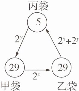 (图中为一个三角形结构,丙袋有5个球,甲袋有29个球,乙袋有29个球,丙袋到甲袋箭头标注$2^{y}$,甲袋到乙袋箭头标注$2^{x}$,乙袋到丙袋箭头标注$2^{x}+2^{y}$)