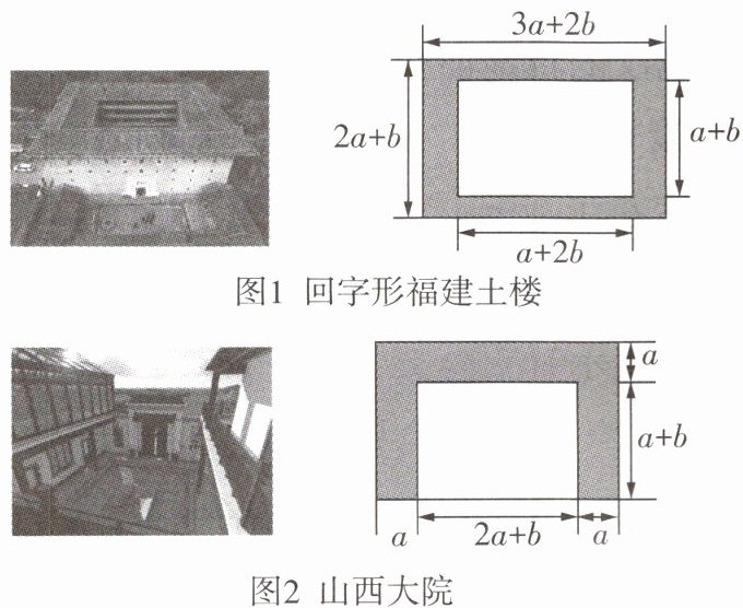 9 [新情境 教材 P35 习题 T7 变式][2025 朔州期末]某校学生在社会实践中,遇到了一些各具特色的建筑,令人印象深刻地有回字形福建土楼(图 1),也有山西大院(图 2),这两个建筑,哪个占地面积(图中阴影)更大?同学们展开了讨论,①组同学认为图 1 中回字形福建土楼的占地面积更大;②组同学认为图 2 中山西大院的占地面积更大.为证明自己的想法,两组同学分别对建筑物进行了测量,数据如图.