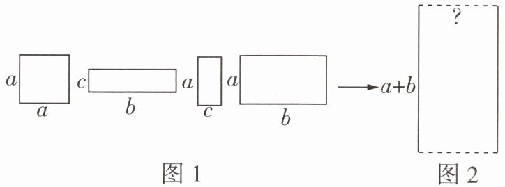 16 图1是甲、乙两个农民伯伯的4块土地的简易图,今年他们决定共同搞投资饲养业,为此他们准备将这4块土地换成一块长为$(a + b)$m的土地(如图2),为使所换到的土地的面积与原来土地的总面积相等,交换后的土地的宽应为多少?