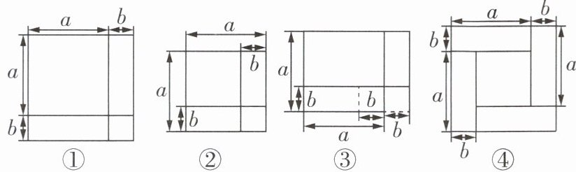 1 [2025 德阳旌阳区期末]我们可以利用图形中的面积关系来解释很多代数恒等式. 给出以下 4 组图形及相应的代数恒等式:①$(a + b)^2 = a^2 + 2ab + b^2$;②$(a - b)^2 = a^2 - 2ab + b^2$;③$(a + b)\cdot (a - b) = a^2 - b^2$;④$(a - b)^2 = (a + b)^2 - 4ab$. 其中,图形的面积关系能正确解释相应的代数恒等式的有 (
