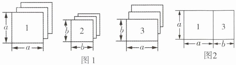 2 我们知道可以用拼图来解释一些多项式的因式分解. 假设有足够多的长方形和正方形卡片,如图 1. 如果选取 1 号、3 号卡片各一张,可以拼成如图 2 所示的形状,根据图 2 可将$a^2 + ab因式分解为a(a + b)$.