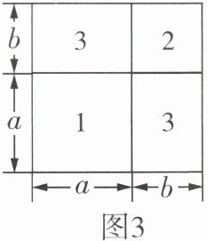 (1)如果分别选取 1 号、2 号、3 号卡片 1 张、1 张、2 张,可拼成如图 3 所示的形状,根据图 3 可将$a^2 + 2ab + b^2$分解因式为______.