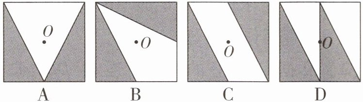 9 [2024广州中考]下列图案中,点$O$为正方形的中心,阴影部分的两个三角形全等,则阴影部分的两个三角形关于点$O$对称的是(