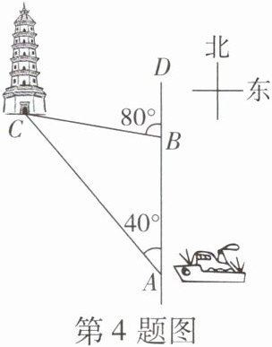 4 [2025 娄底期末]如图,上午$10:00$,一艘轮船从$A地出发以20$海里/时的速度向正北航行,中午$12:00到达B$地,从$A$,$B两地观望灯塔C$,测得$\angle DAC = 40^{\circ}$,$\angle DBC = 80^{\circ}$,则从$B地到灯塔C$的距离为