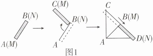 ③连接 $CB$ 并延长,将木条沿点 $C$ 到点 $B$ 的方向平移,使得端点 $M$ 与点 $B$ 重合,端点 $N$ 在 $CB$ 延长线上的落点记为点 $D$;