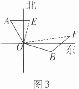 (3)如图3,在某次军事演习中,舰艇甲在指挥中心(O处)北偏西30°方向的A处,舰艇乙在指挥中心南偏东70°方向的B处,并且两舰艇到指挥中心的距离相等,接到行动指令后,舰艇甲向正东方向以60海里/时的速度、舰艇乙沿北偏东50°的方向以80海里/时的速度前进1.5小时后,指挥中心观测到甲、乙两舰艇分别到达E,F处,且两舰艇之间的夹角为70°,试求此时两舰艇之间的距离.