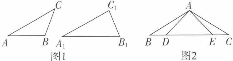 3 [2024 遂宁中考]如图 1,$\triangle ABC$ 与 $\triangle A_1B_1C_1$ 满足 $\angle A = \angle A_1$,$AC = A_1C_1$,$BC = B_1C_1$,$\angle C \neq \angle C_1$,我们称这样的两个三角形为“伪全等三角形”。如图 2,在 $\triangle ABC$ 中,$AB = AC$,点 $D$,$E$ 在线段 $BC$ 上,且 $BE = CD$,则图中共有“伪全等三角形”(