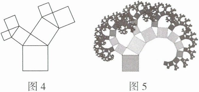 .(2)如图4是由图1中的两个小正方形分别向外作直角三角形,再以所得的直角三角形的直角边为边分别向外作正方形,图5是重复上述步骤若干次后得到的勾股树. 已知图1中的$S_{1}= 13$,求10次操作后图形中所有正方形的面积.