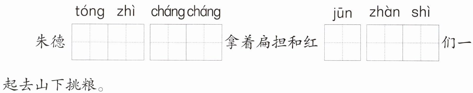 (1)白天挑粮爬山,晚上还常常整夜整夜地研究怎样跟敌人打仗。大家看了心疼,就把他那根扁担藏了起来。