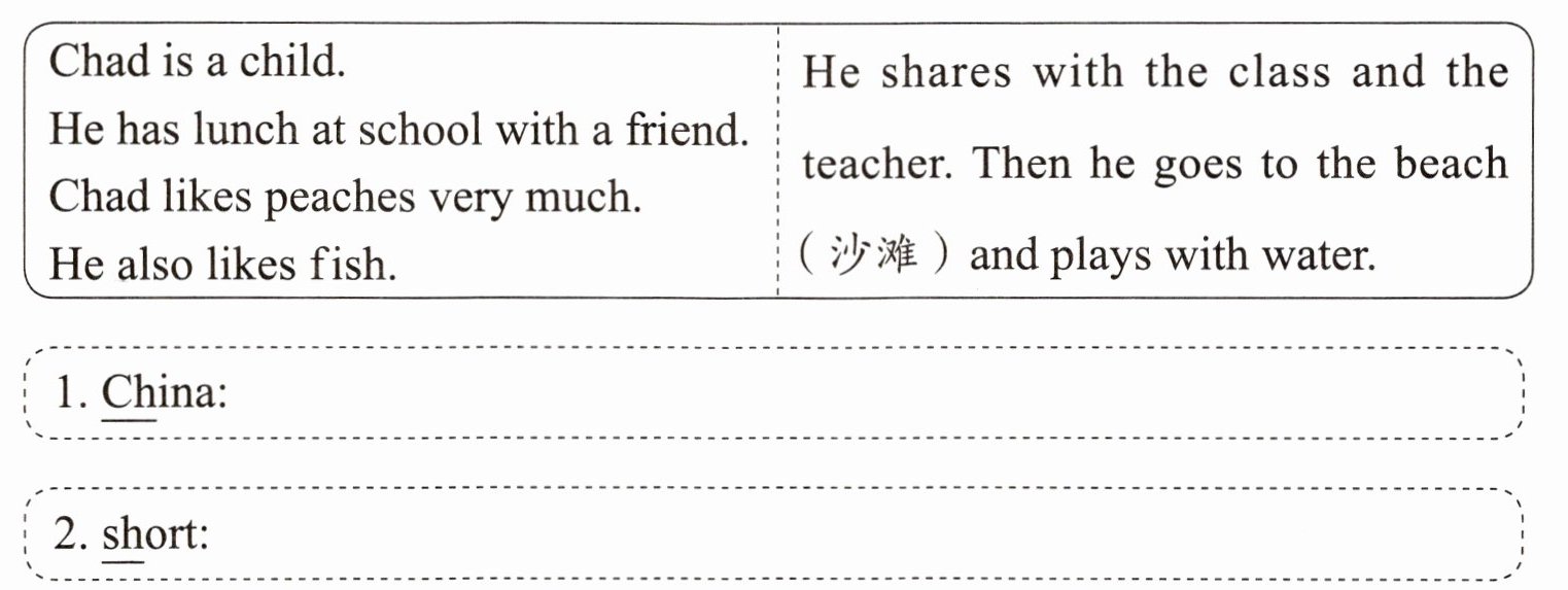 1. Chad child lunch peaches much teacher beach 2. fish shares