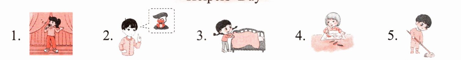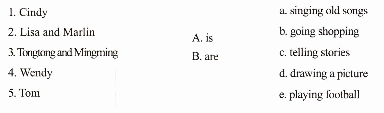 Cindy is telling stories to her sisters. Lisa is singing old songs with Marlin. Tongtong and Mingming are playing football. Wendy is drawing a picture under the tree. There is a shop in the park. Tom is going shopping there. He’s hungry (饥饿的). He wants some snacks (点心).