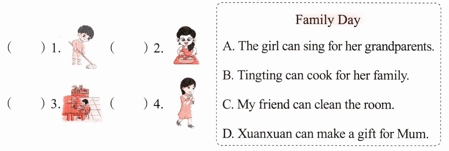 二、“Family Day (家庭日)”快到了,看看同学们能为家人做些什么?看一看,选择与图片相符的句子。