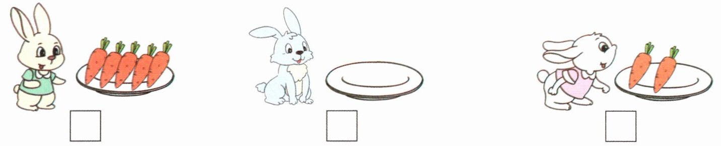 每只小兔分得同样多的胡萝卜,想一想,哪只小兔吃得最多?画“√”。哪只小兔吃得最少?画“○”。