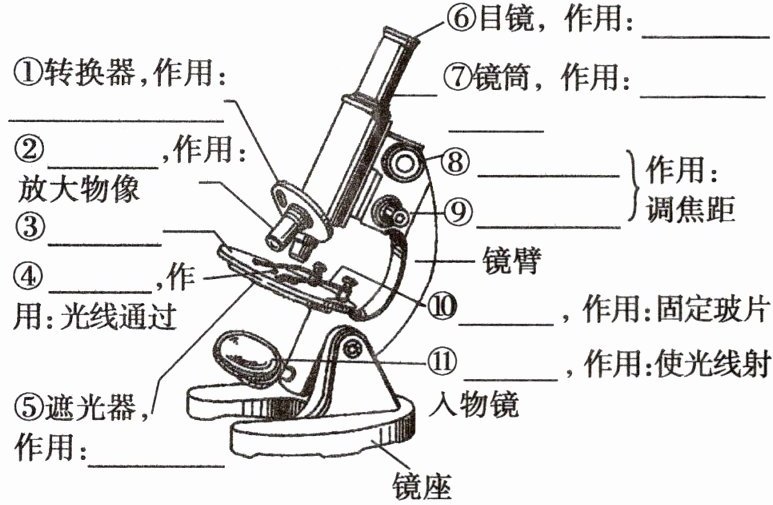 ①安装及调换物镜 ②物镜 ③载物台 ④通光孔 ⑤调节光线 ⑥放大物像 ⑦连接目镜和物镜 ⑧粗准焦螺旋 ⑨细准焦螺旋 ⑩压片夹 ⑪反光镜