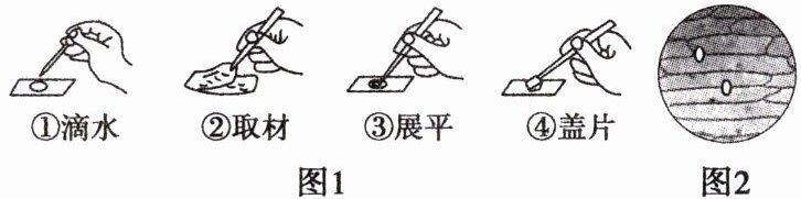 5. (张家界市中考)图 1 是制作洋葱鳞片叶内表皮细胞临时装片的基本步骤。若在显微镜中观察到的图像如图 2 所示,则制作装片步骤中最可能出现问题的是(