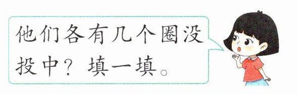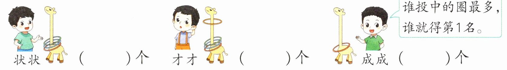 2 1 4 才才 【解析】看图可以知道,状状投中了3个,才才投中了4个,成成投中了1个。4>3>1,才才投中的圈最多,所以才才得了第1名。每个小朋友投5个圈,要求他们没投中的个数,可以根据5的组成求出结果。5可以分成3和2,所以状状有2个没投中;5可以分成4和1,所以才才有1个没投中,成成有4个没投中。