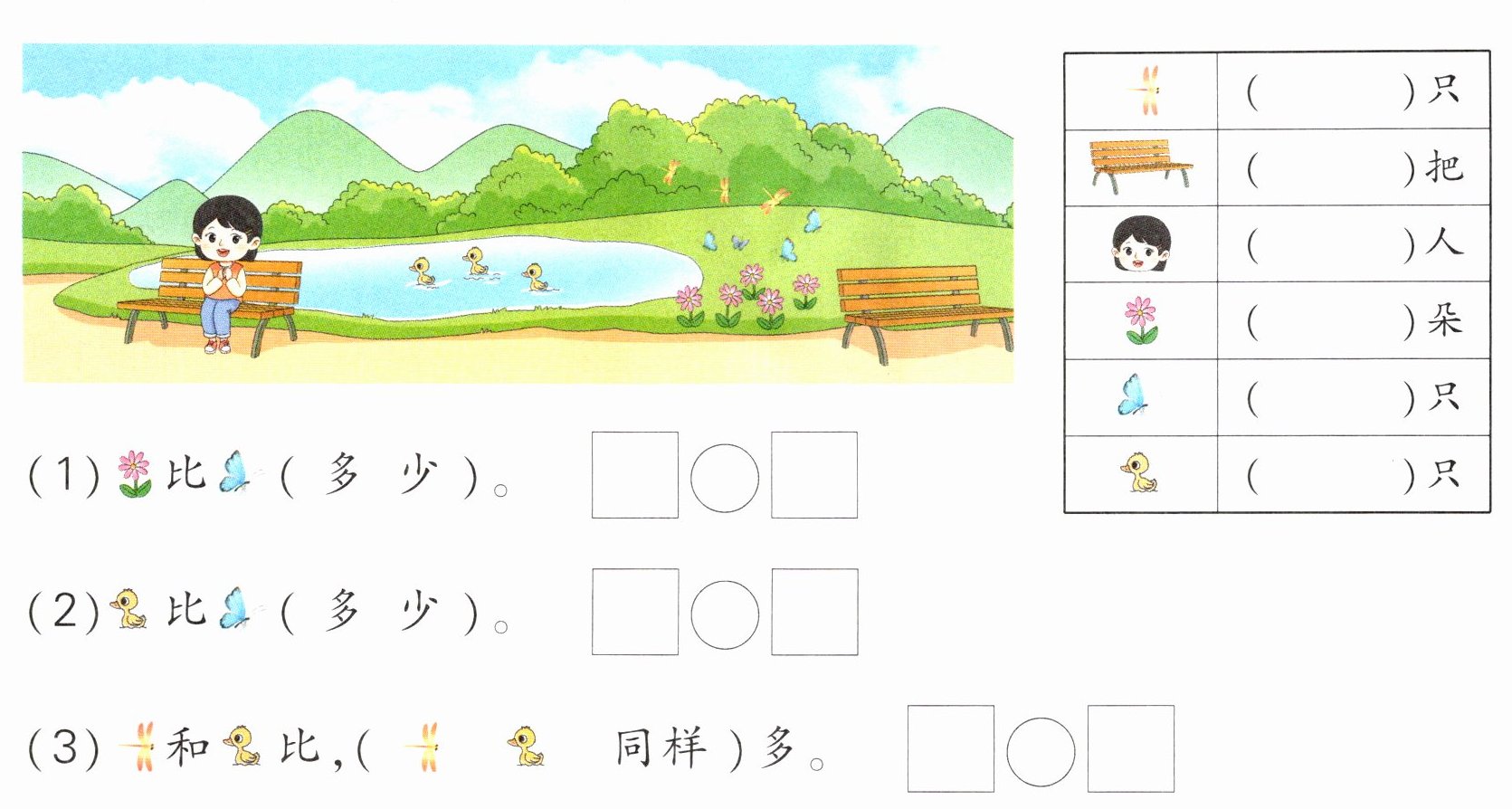 3 2 1 5 4 3(1)多 5>4 (2)少 3<4(3)同样 3=3