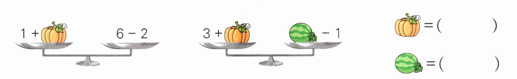 4. 两边得数相等时天平平衡,下面的“瓜”分别代表几?