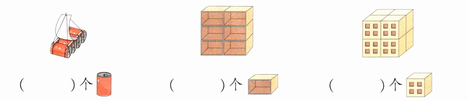 3. 下面作品主要用易拉罐和快递箱制成,数一数,填一填。
